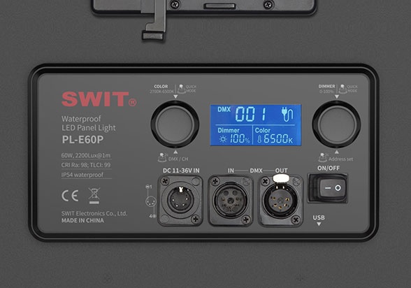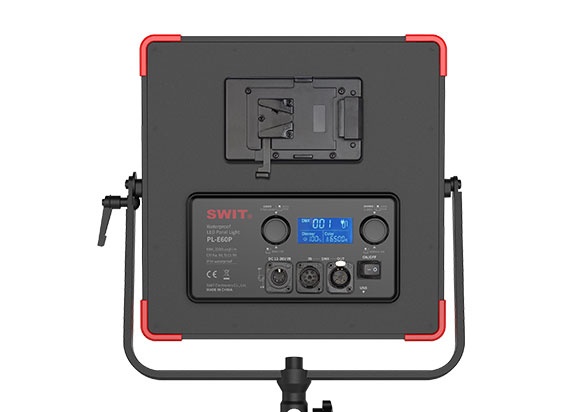 PL-E60P背面配备一块液晶显示屏,可显示当前光照的照度值、色温值,DMX通道,以及电池剩余电量信息。