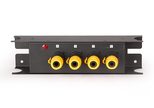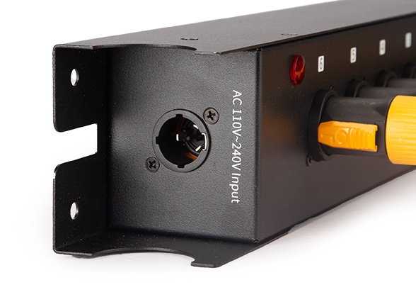 PA-J416 一路进六路出,输入3×2.5²电缆线,输出3×1.5²电缆线,三芯16A扭锁电源插头输入输出,每台分线盒输出可串联灯灯具使用(200W以内最多不超过12台);通常演播方案设计中6台灯具标配一个电源分线盒,这样既解决线材多、乱、安全问题,也可以对灯具进行分组控制便于检修。