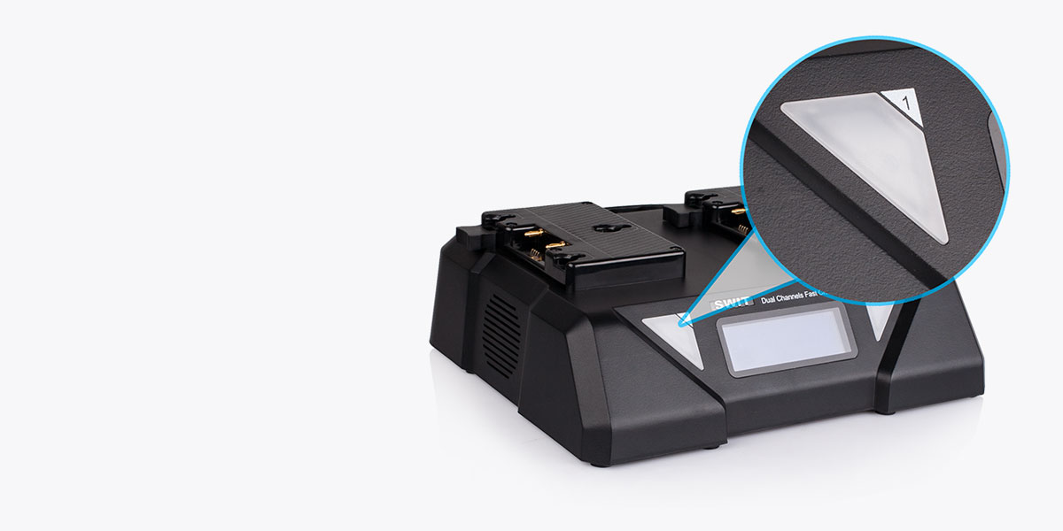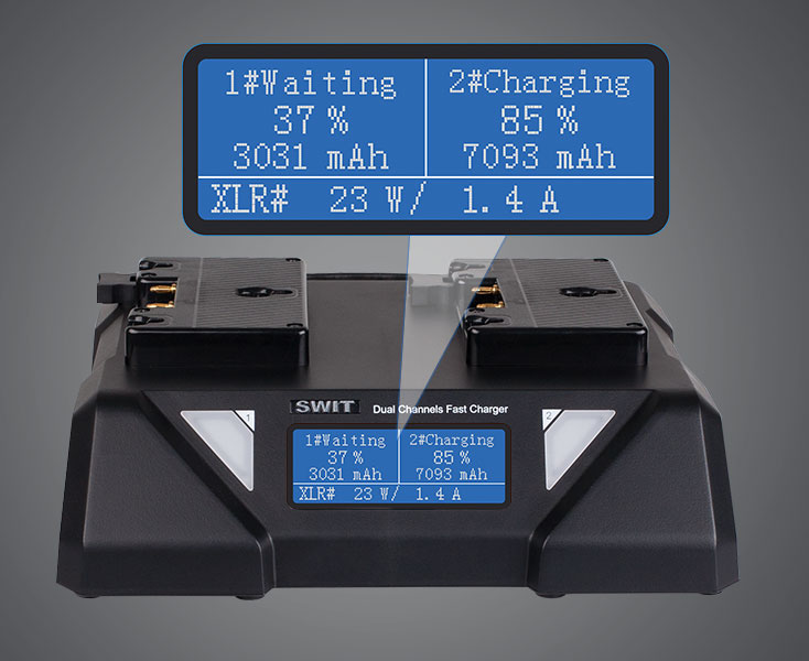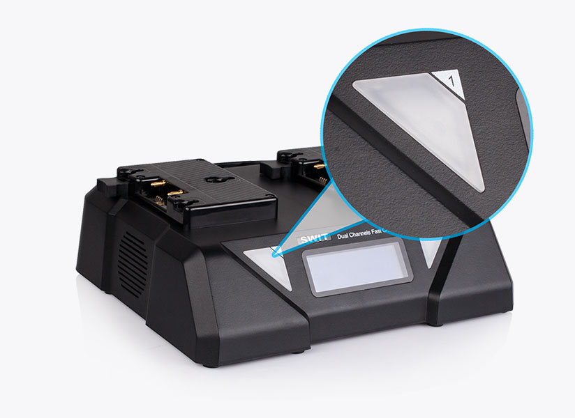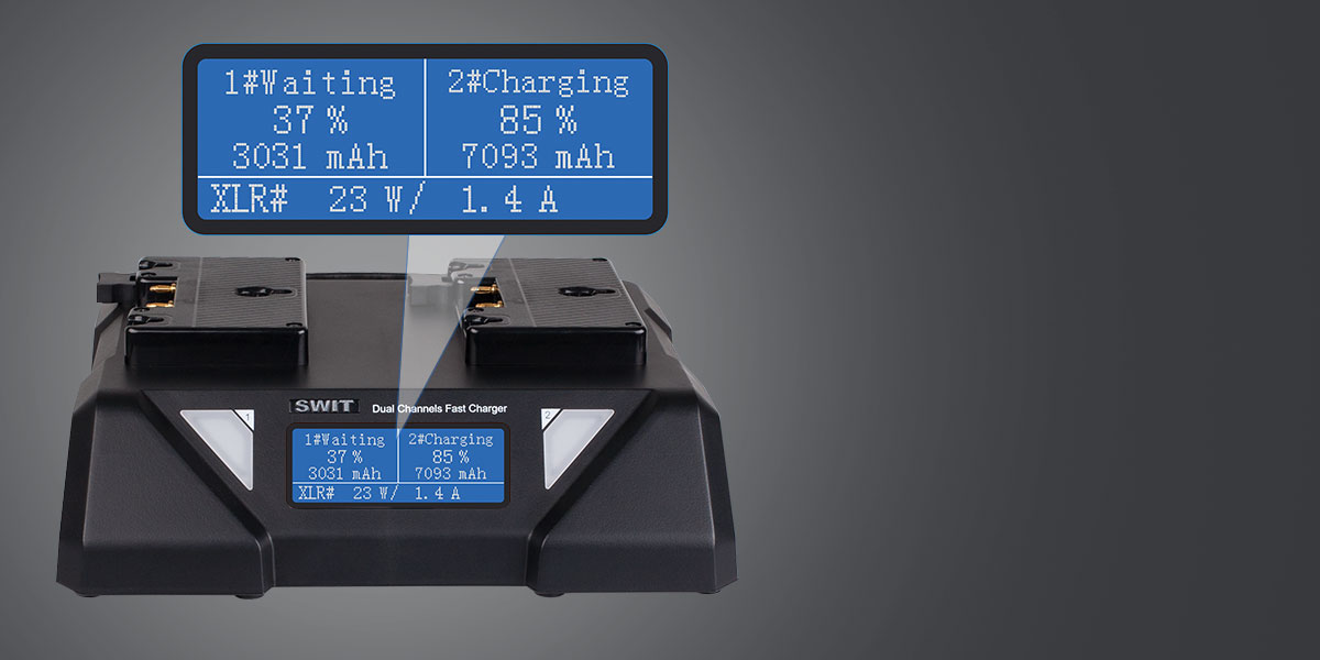 SC-3260G可对2个安顿型电池同时充电,通过智能识别电池类型,可为SWIT S-8043G, S-8062G, S-8065G等电池采用6A大电流快速充电,其他品牌或小容量电池均采用3A电流充电。