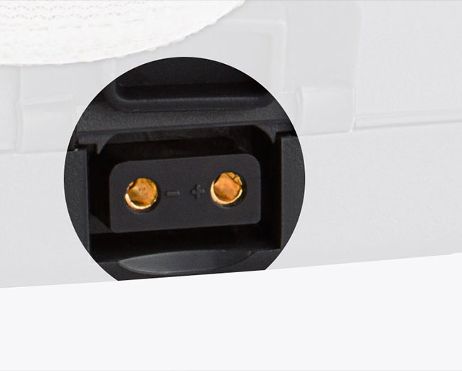 电池顶部配备D-tap口直流输出,额定14.4V,可为机头灯、监视器、无线传输等摄像机端设备供电。