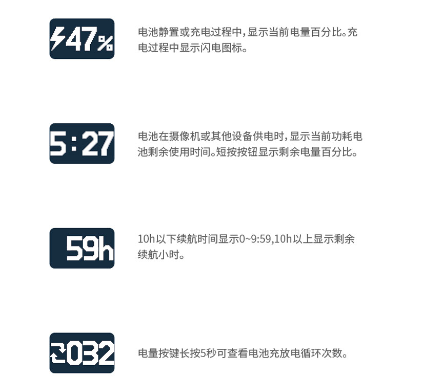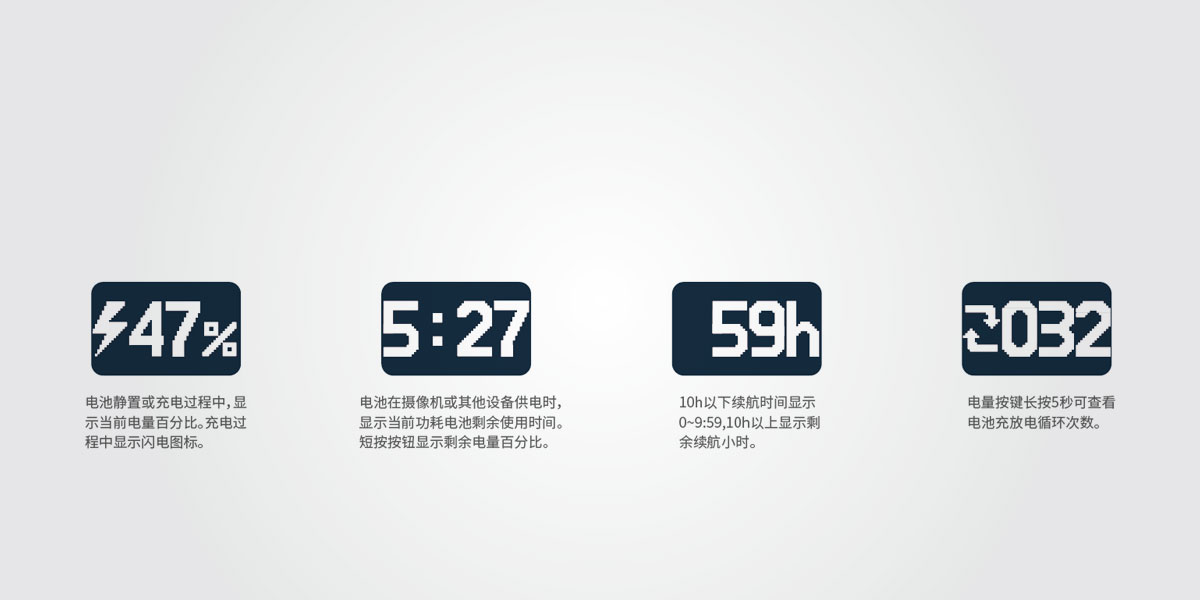 配备OLED显示屏,OLED液晶屏可显示剩余电量百分比、剩余续航时间、充放电循环次数等。