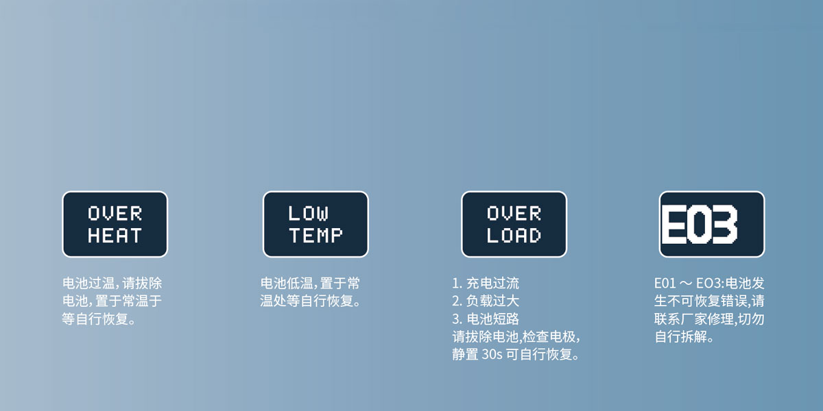 电池遇到任何过载、过充/过放、短路、过温等异常情况,将启动自我保护机制。根据电池显示的保护信息采取相应措施,重新激活电池,可以有效避免风险,延长电池使用寿命。