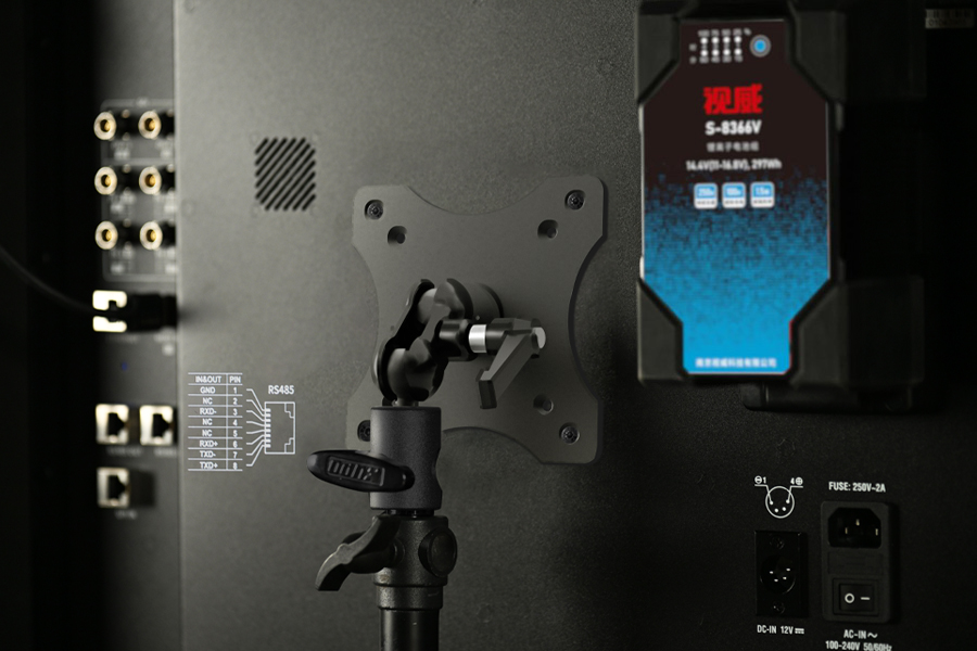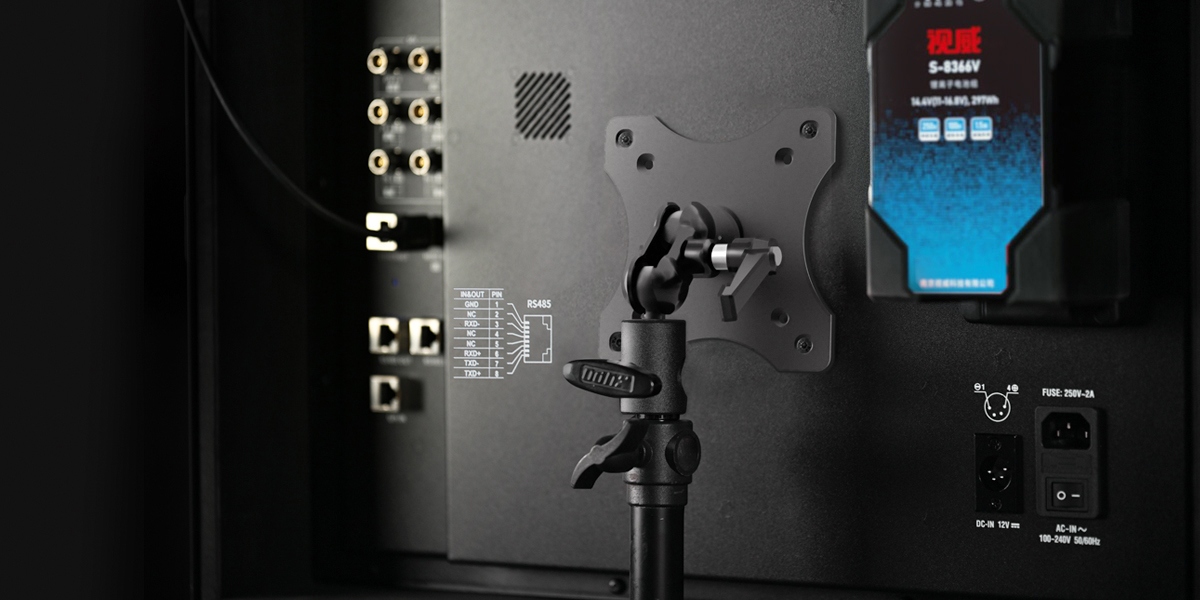 监视器提供标准10×10 VESA 安装孔位,可选购VESA转C-stand支架,在影视片场可将监视器安装在灯杆上,方便任意位置监看。