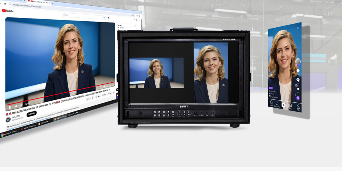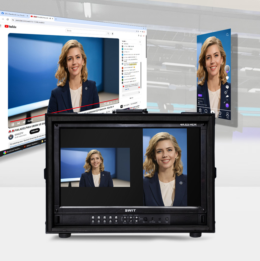 将一路输入视频左右同时显示横屏全画面及竖屏裁切画面,用于横竖各种直播平台同时制作监看。