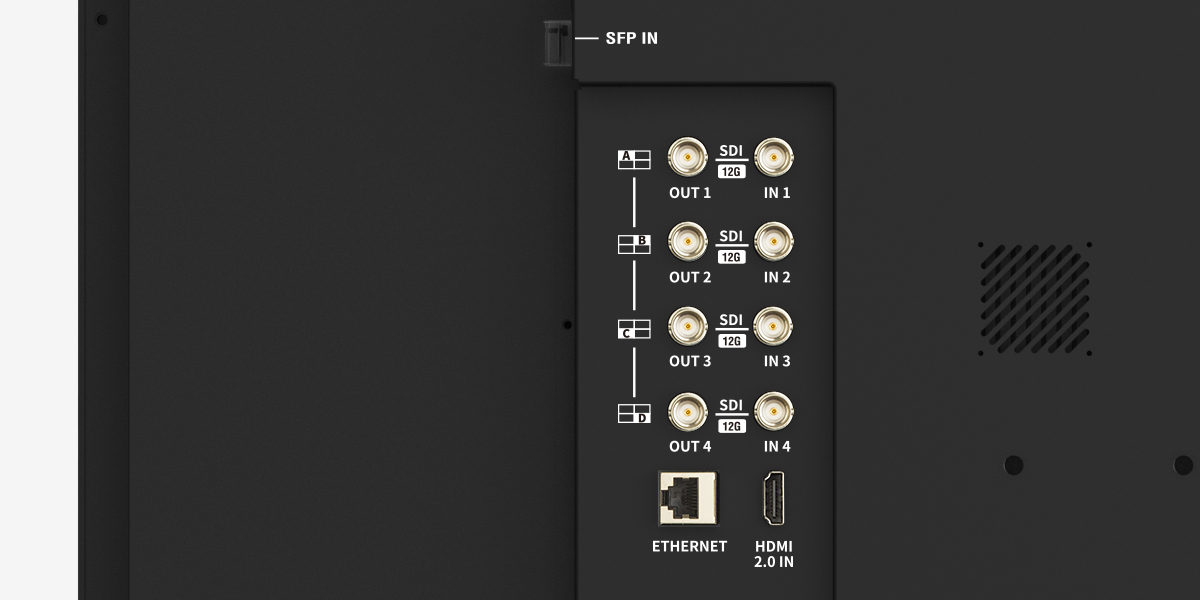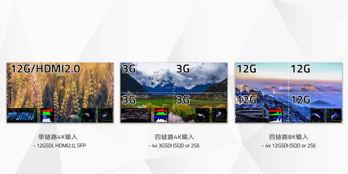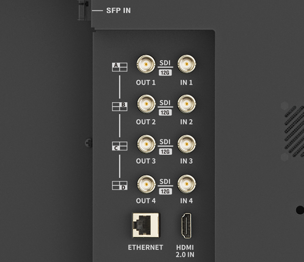 支持 12G-SDI、HDMI®2.0 及 SFP 光纤单链路 4K 输入,以及 4x 3GSDI 四链路 4K 输入、4x 12GSDI 四链路 8K 输入,四链路支持 SQD 四