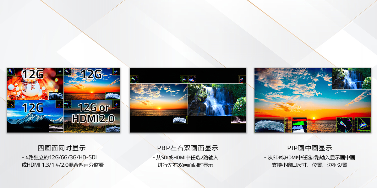 还可以任选 2 路输入信号进行 PBP 左右双画面监看和 PIP 画中画监看。