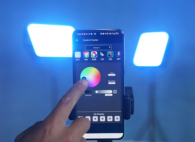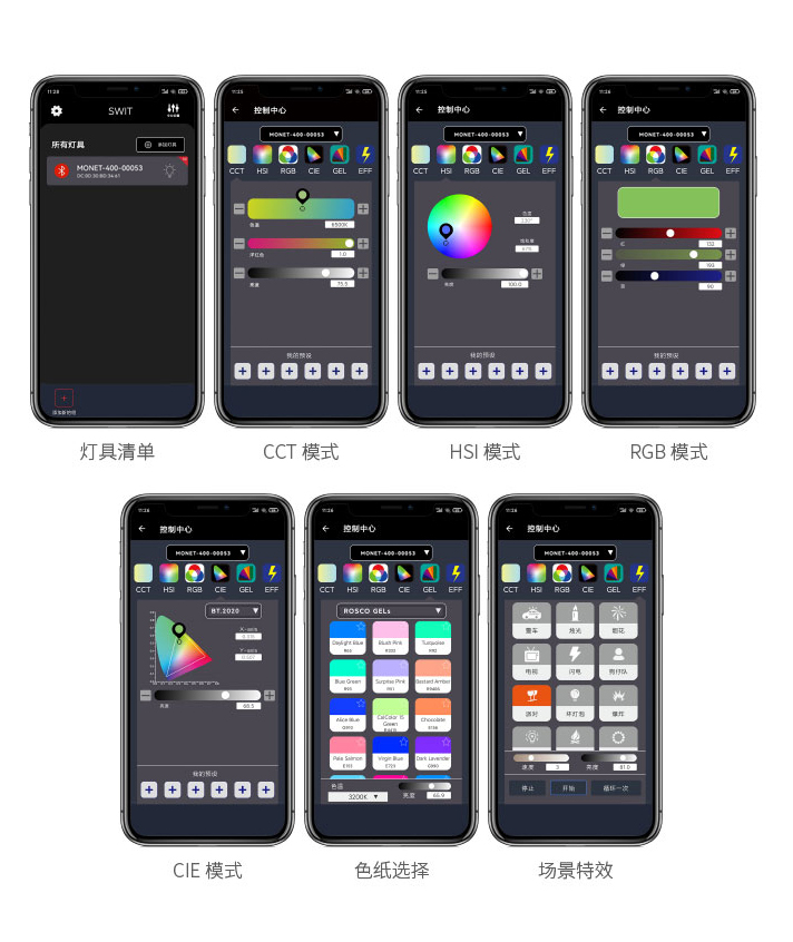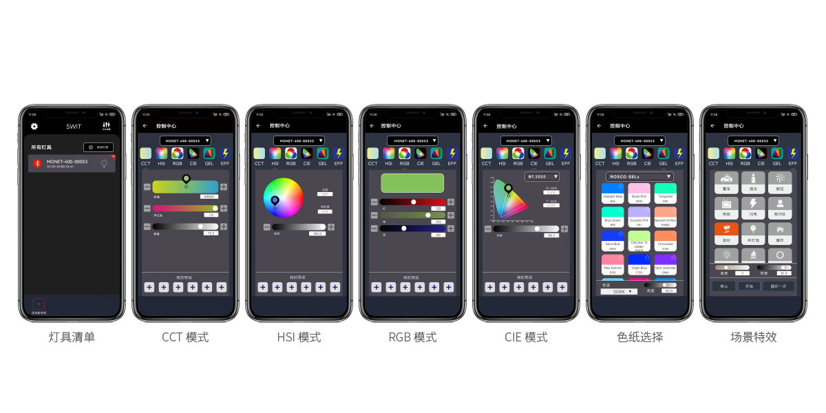 可通过APP进行加灯、组灯、支持CCT色温模式、HSI/RGB/CIE彩灯模式、模拟灯效/GEL色纸选择,及专业推杆灯控模式等