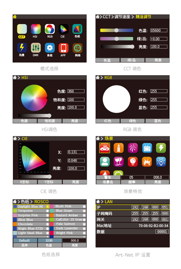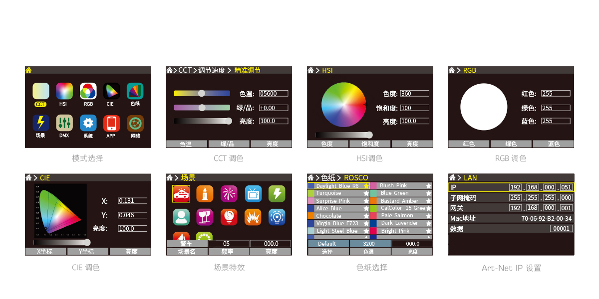 › CCT/HSI/RGB/CIE/GEL/EFF色彩模式
