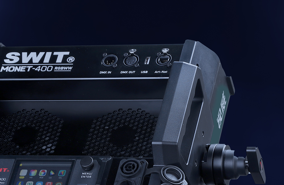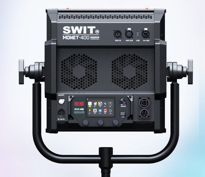 莫奈400提供多种操控信号接口和供电方式,支持DMX512输入/输出,Art-Net网口接入,USB-A 5V供电输出及固件升级,3芯卡侬DC48V输入,以及航空头True1 AC输入及环出接口。配备3.5英寸彩屏,可视化选取色彩。