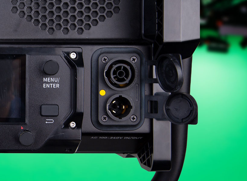 莫奈400 支持航空头PowerCON True1 100-240V AC 输入和环出,在搭建灯光系统时可以更方便的布置电源线。同时,也支持一个3芯卡侬 DC 48V供电接口,在影棚移动照明应用中可以方便使用电池或移动电源供电。
