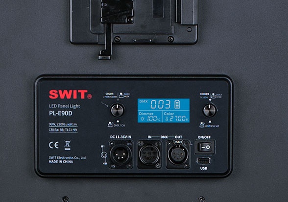 PL-E90D背面配备一块液晶显示屏,可显示当前光照的照度值、色温值,DMX通道,以及电池剩余电量信息。